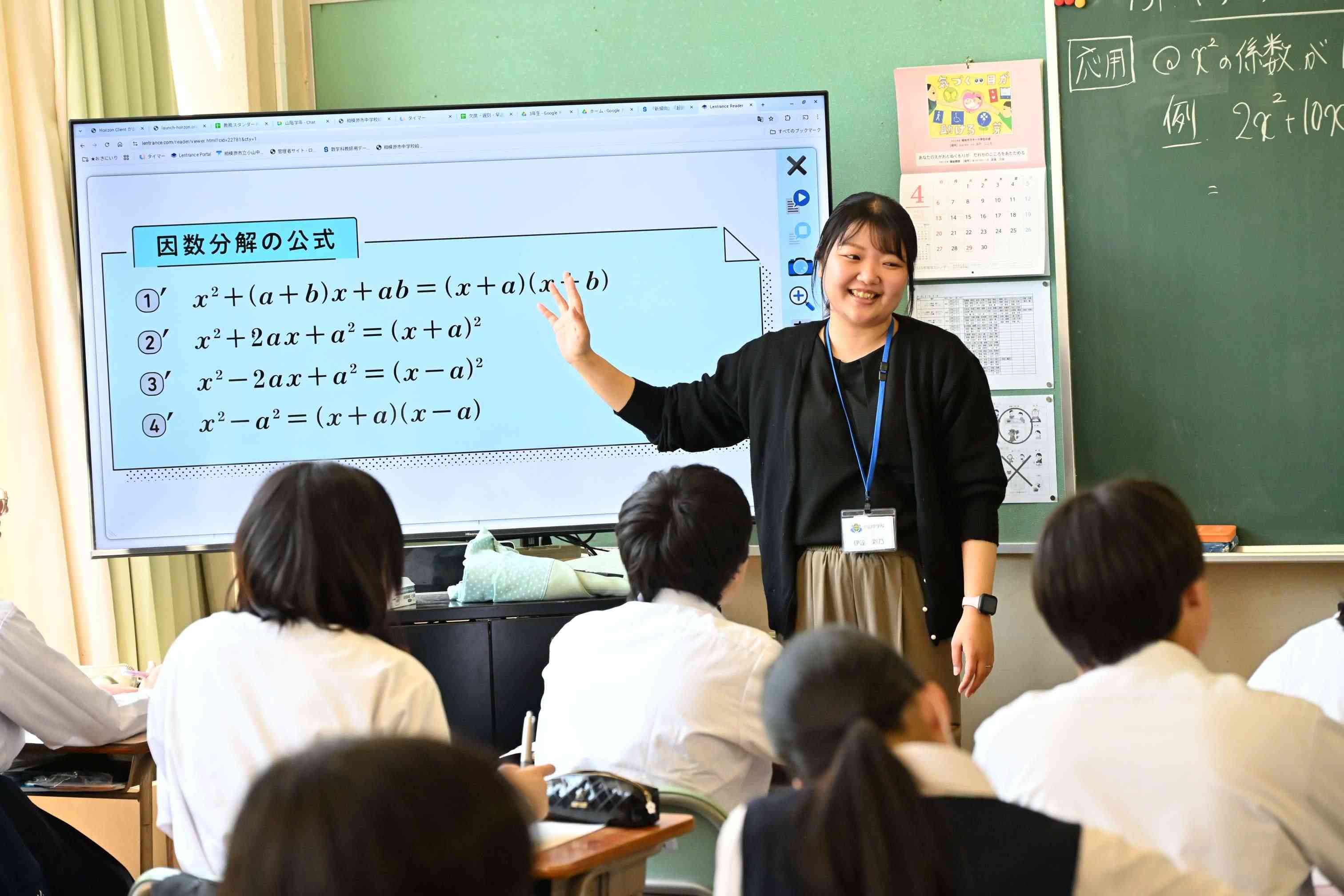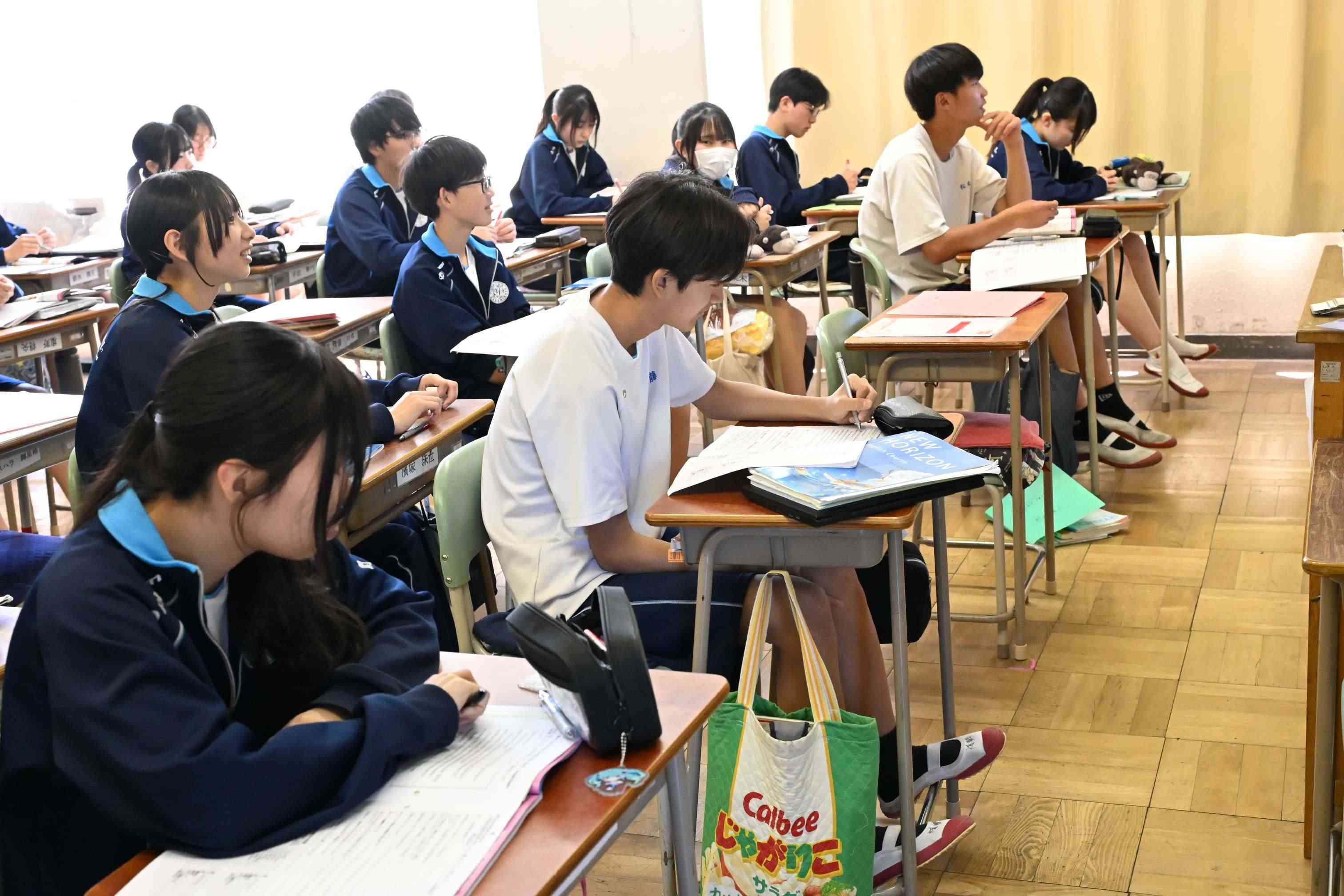 3校時の3年3組(3並び)。社会で「環境問題と循環経済」について学んでいました。